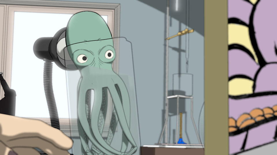 A scientist defends his home from a zombie octopus with nothing but a broom and a pair of kitchen gloves. What's not to love?